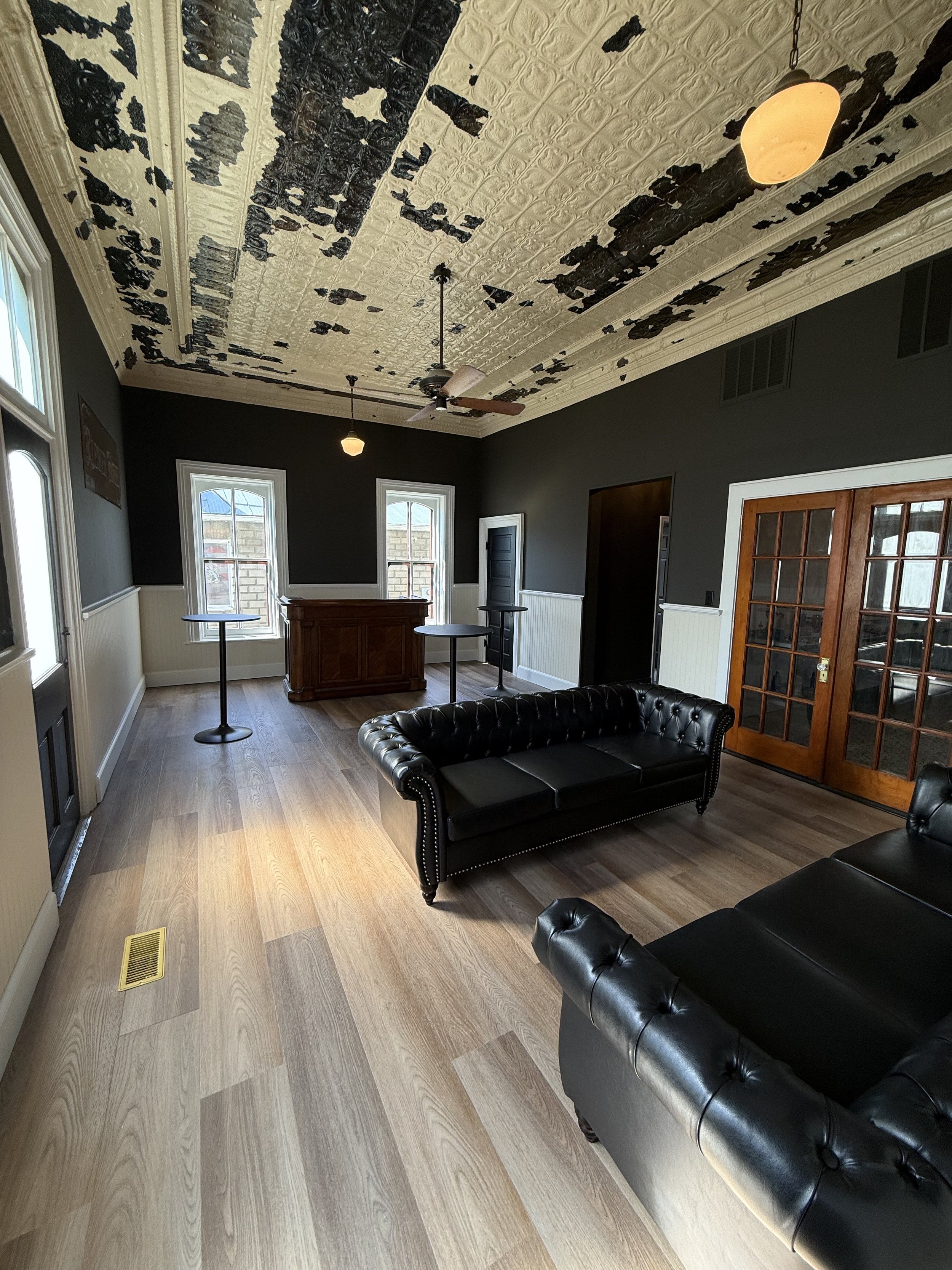 At the heart of The Historic lies the grand ballroom—where countless celebrations have taken place since 1865. The original hardwood floors, now restored to a rich honeyed glow, provide the perfect stage for receptions of up to 75 guests. High ceilings sparkle with chandeliers recreated from historic photographs, creating an atmosphere ideal for dinner, dancing, and heartfelt toasts.